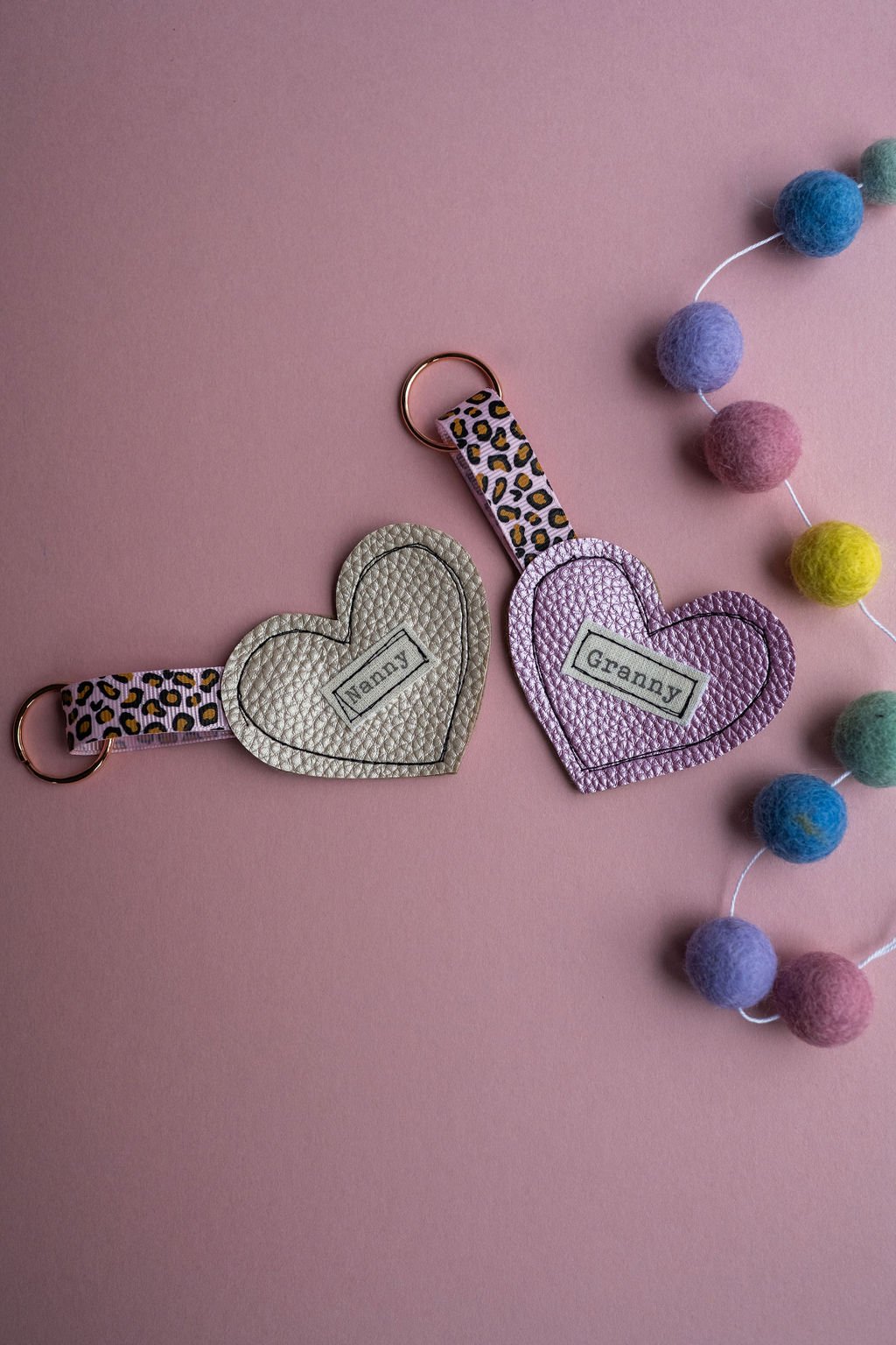Gold leatherette, backed with wool blend grey felt, cool leopard print ribbon and sturdy rose gold keyring!
